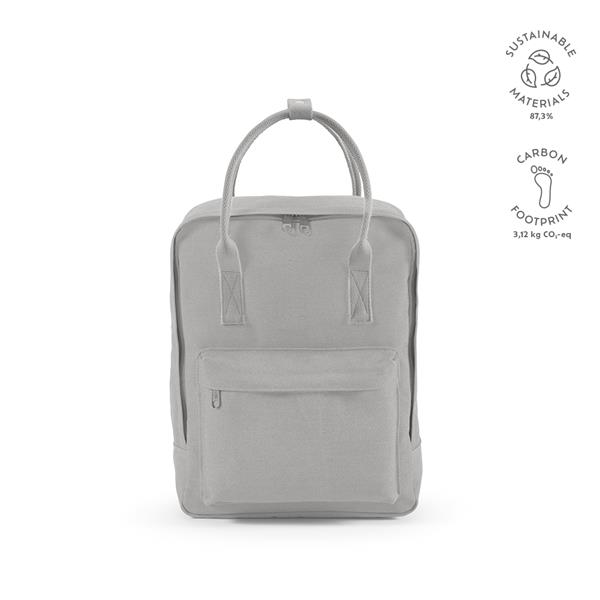 Wykonany z bawełnianego płótna z recyklingu (450 g/m2), ten plecak o pojemności 18 litrów jest przykładem zrównoważonego rozwoju. Posiada dwa uchwyty umieszczone dla większej wygody i paski na ramię z rPET. Posiada również przednią kieszeń. Zapakowany w torbę PE z recyklingu.