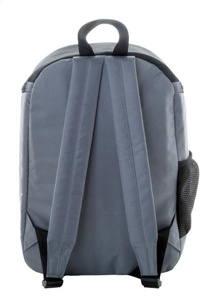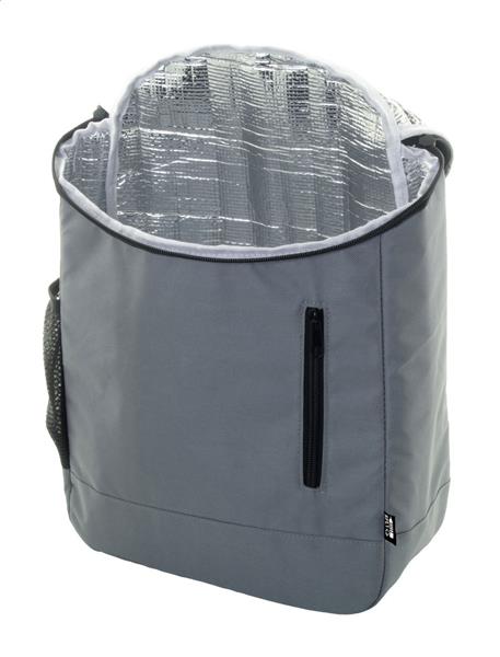 Plecak termoizolacyjny RPET z aluminiową wyściółką, boczną kieszenią z siateczki, komorą główną zapinaną na zamek i kieszenią przednią. Poliester 600D RPET, z charakterystyczną metką RPET.