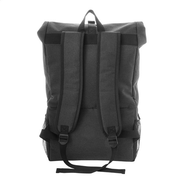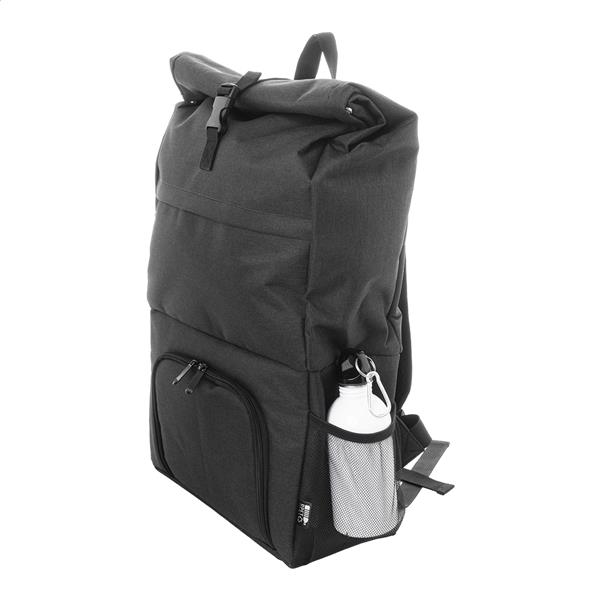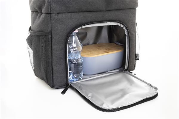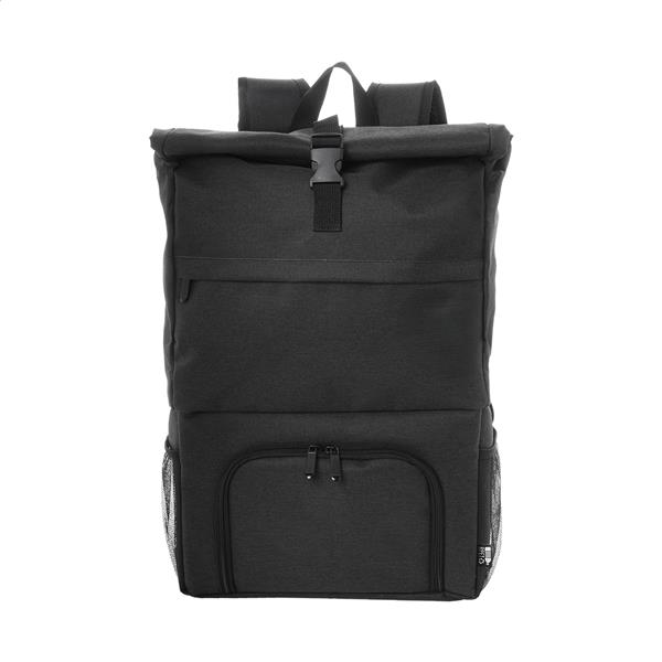 Plecak termoizolacyjny Rolltop RPET z zapinaną na suwak komorą chłodzącą PEVA na lunch box. Z główną komorą zamykaną na suwak, przednią kieszenią zapinaną na suwak, bocznymi kieszeniami z siatki i wyściełanymi paskami na ramię. Poliester RPET 600D z charakterystyczną metką RPET.