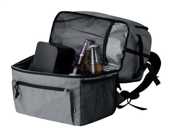 Plecak RPET z wyściełaną komorą termiczną PEVA, kieszeniami zapinanymi na zamek, bocznymi kieszeniami z siateczki, wyściełanymi plecami i szelkami. Poliester 600D RPET, z charakterystyczną metką RPET.
