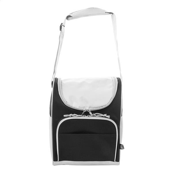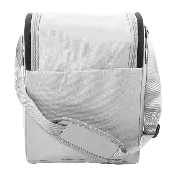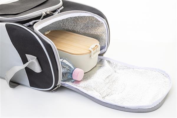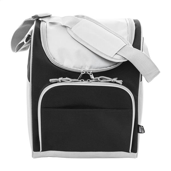 Torba termiczna RPET z aluminiową wyściółką. Z 2 przegrodami na suwak, małą kieszenią z przodu i regulowanym paskiem na ramię. Poliester 600D RPET z charakterystyczną metką RPET.