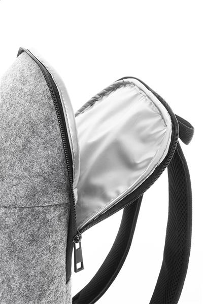 Plecak termoizolacyjny RPET z filcu z wyściółką PEVA. Z wyściełanymi paskami na ramiona, główną komorą zapinaną na suwak i przednią kieszenią. Z charakterystyczną metką RPET.