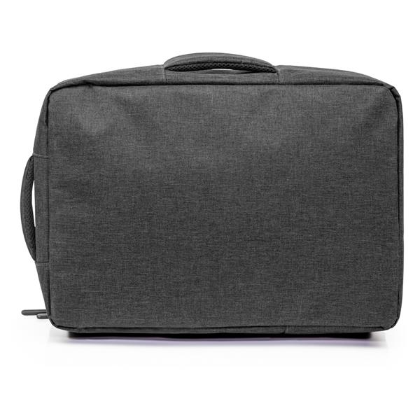 Plecak na laptopa 15,6″ z bocznym uchwytem umożliwiającym funkcjonowanie jako torba na laptopa, zapinana główna przegroda z miękką kieszenią na laptopa lub dokumenty, 2 małe kieszenie oraz 2 szlufki na długopisy, zamek błyskawiczny z dodatkowym pullerem ułatwiającym rozpinanie, pasek do zamocowania na torbie podróżnej, posiada regulowane paski na ramię umożliwiające dopasowanie ich długości do własnych preferencji, produkt wykonany z RPET