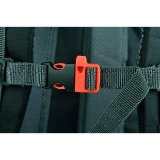 Plecak posiada watowane szelki oraz plecy, pas w talii, taśmy kompresyjne na bokach plecaka, siateczkowe kieszenie na butelki z obu stron, pętle, dwie kieszenie awaryjne, kieszeń z przodu z klamrą, środkową kieszeń na zamek z przedziałką na drobiazgi, zapinaną główną kieszeń z przestronną główną komorą z oddzielną kieszonką wewnątrz. W zestawie również pomarańczowy gwizdek. Materiał: poliester 420D, PVC poliester 210D ripstop z pubacking, 210D poliestrowa podeszwka. Pojemność 31 l.