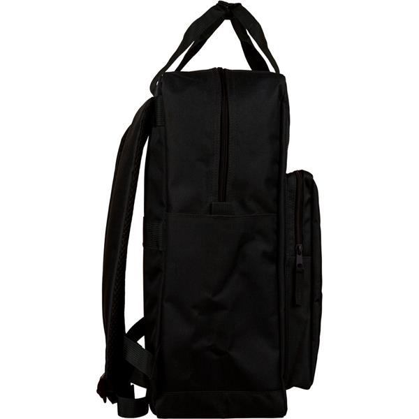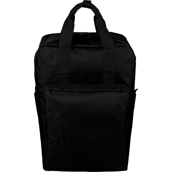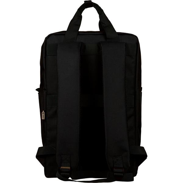 Plecak, podszewka z poliestru 210D, główna kieszeń zapinana na zamek, wewnętrzna przegroda na laptopa 16″, mniejsza przednia kieszeń zapinana na zamek, regulowane i wentylowane paski do noszenia, pasek do przymocowania do walizki, kieszenie boczne po obu stronach, produkt wykonany z poliestru 600D z recyklingu