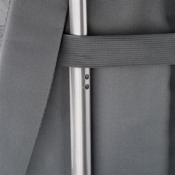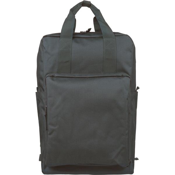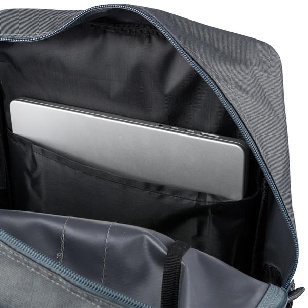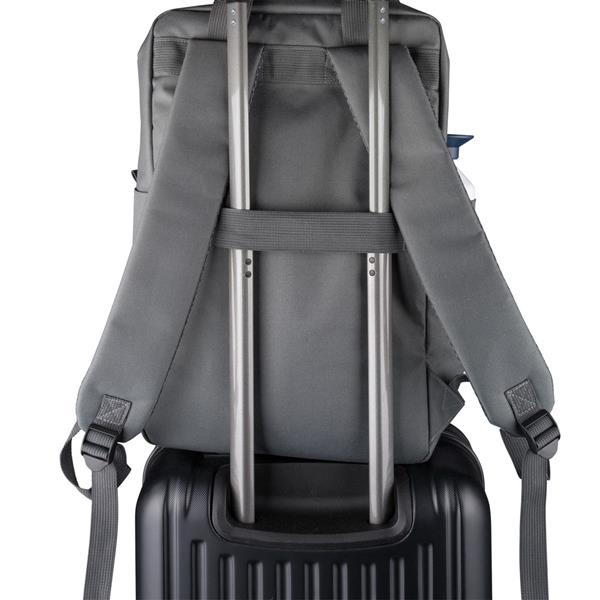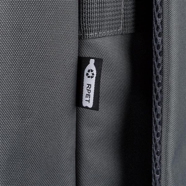 Plecak, podszewka z poliestru 210D, główna kieszeń zapinana na zamek, wewnętrzna przegroda na laptopa 16″, mniejsza przednia kieszeń zapinana na zamek, regulowane i wentylowane paski do noszenia, pasek do przymocowania do walizki, kieszenie boczne po obu stronach, produkt wykonany z poliestru 600D z recyklingu