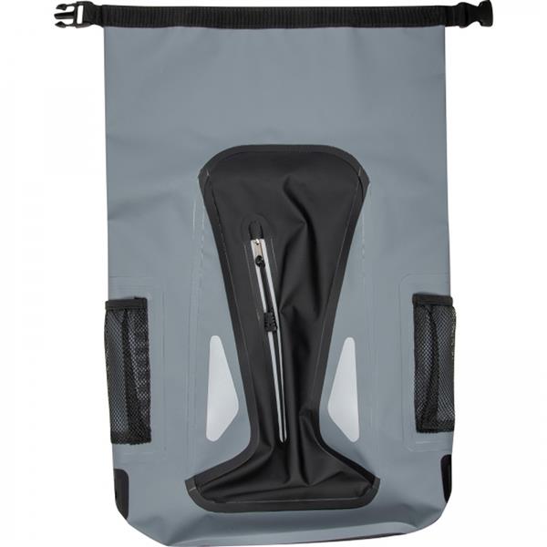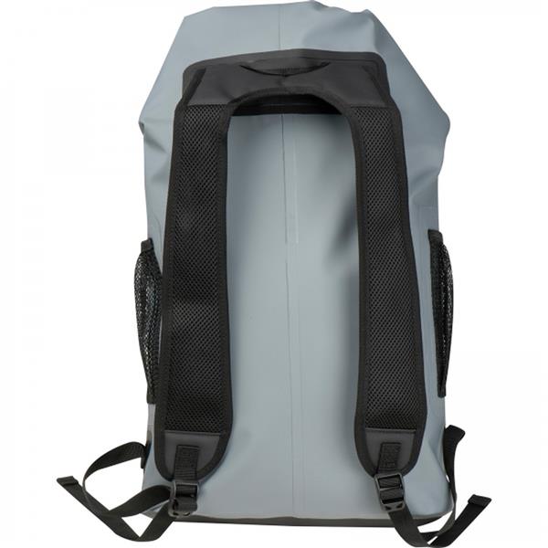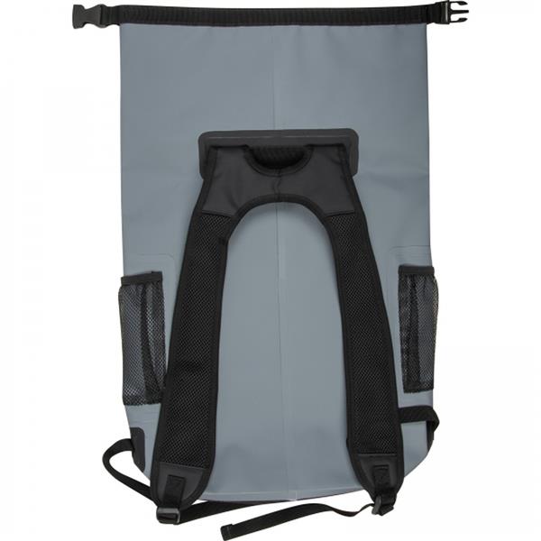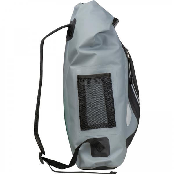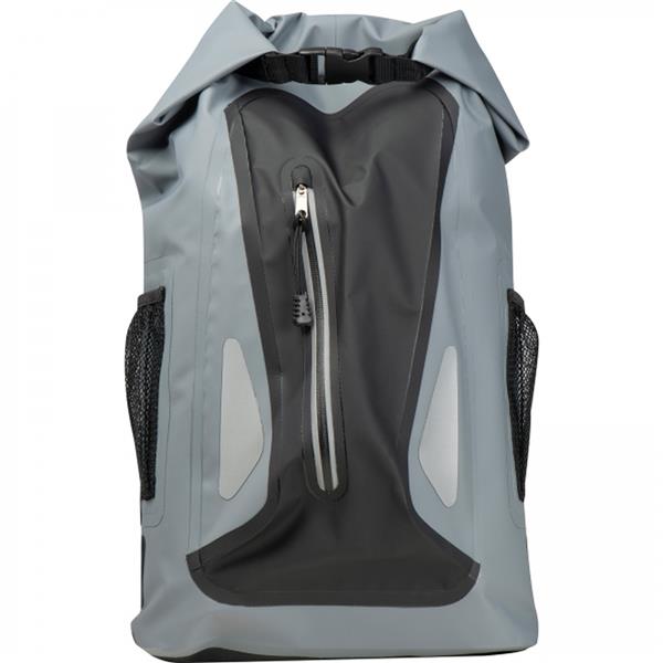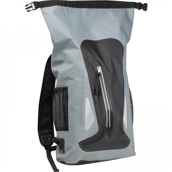 Wodoodporny plecak, wykonany z 600D PVC, z odblaskową powierzchnią, watowanymi szelkami oraz kieszonką na butelkę. Wewnątrz znajdują się przegródki ułatwiające organizacje ekwipunku.