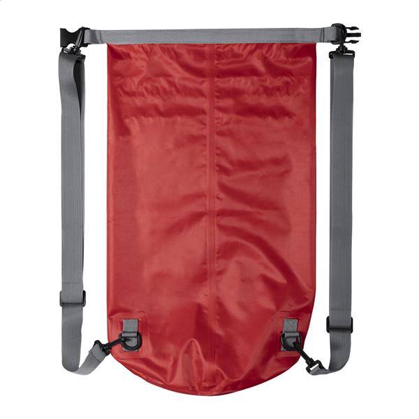 Wodoodporna, sucha torba z materiału ripstop z plastikową klamrą i regulowanymi paskami na ramię.