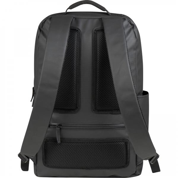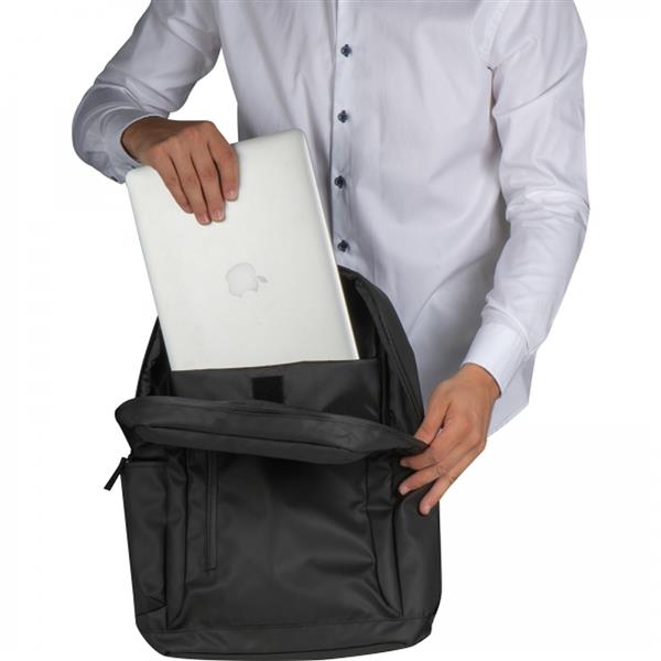 Wysokiej jakości, wodoodporny plecak, wykonany z materiału 600 DPU, ze wzmacnianymi, oddychającymi szelkami. Posiada boczną i wewnętrzną kieszeń oraz przegródkę antykradzieżową. Odpowiedni dla laptopów do 15,8`.