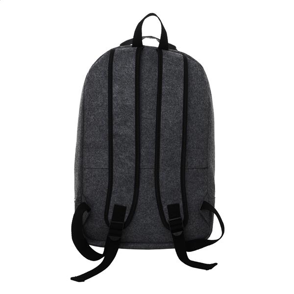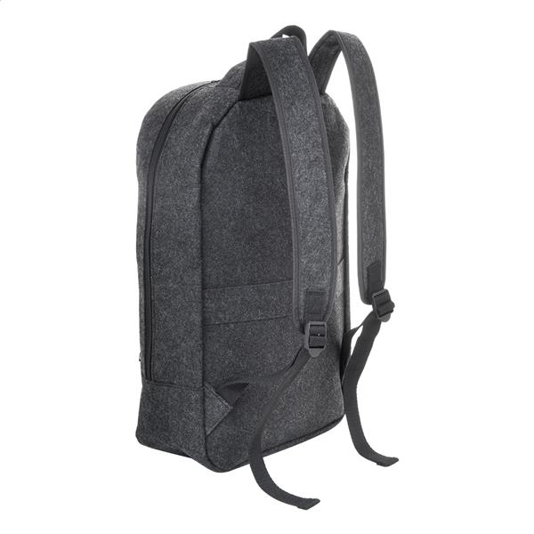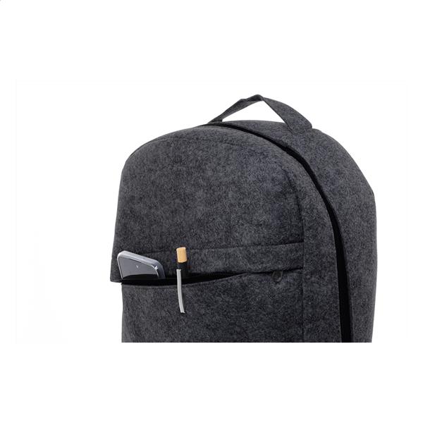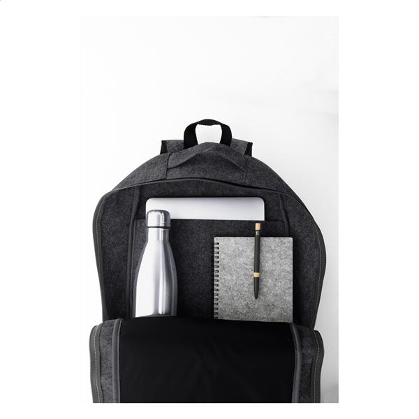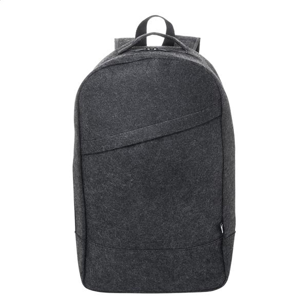 Plecak z filcu RPET z główną kieszenią zapinaną na suwak i kieszenią z przodu. Z przegrodą na laptopa (15″), paskiem na walizkę i wyściełanymi paskami na ramię. Z charakterystyczną metką RPET.