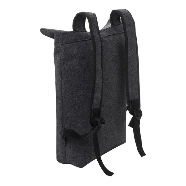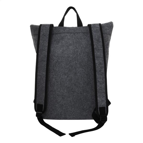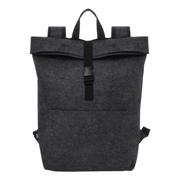 Plecak z filcu RPET z rolowaną górą, zapinaną na klamrę główną kieszenią oraz kieszenią z przodu na suwak, przegrodą na laptopa (15″) i wyściełanymi paskami naramiennymi. Z charakterystyczną metką RPET.