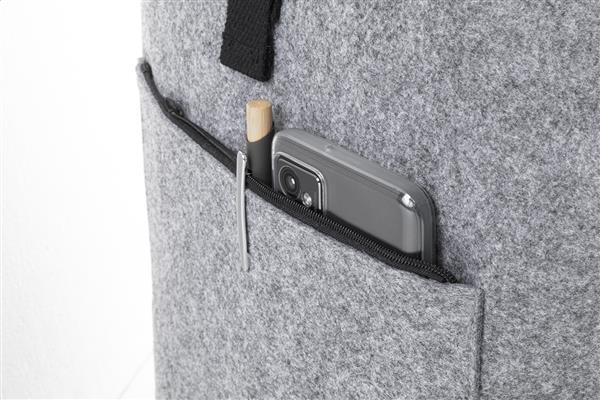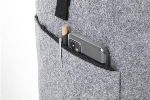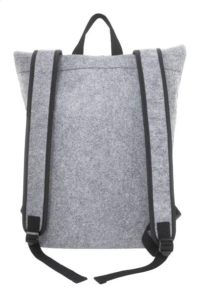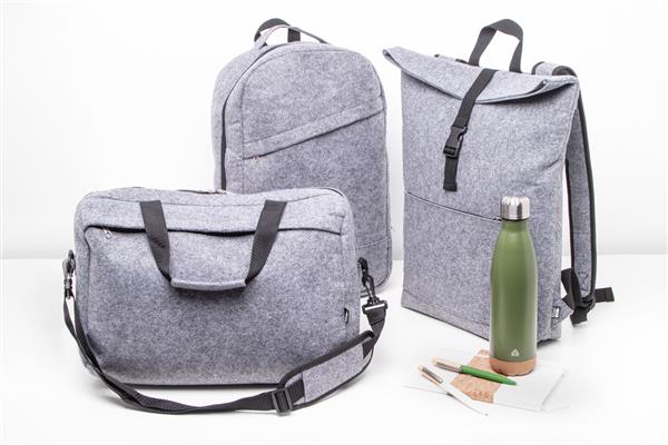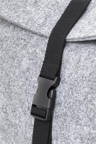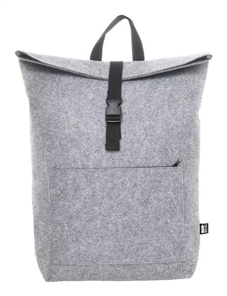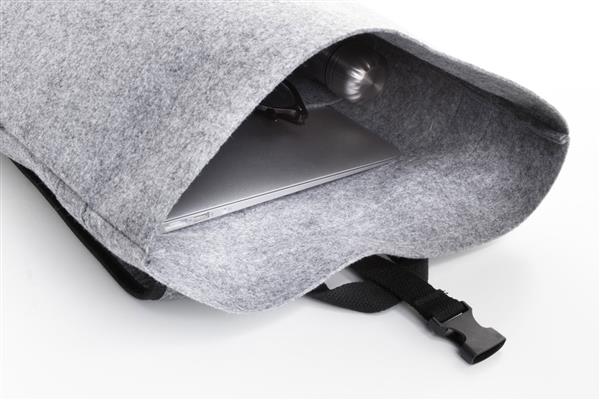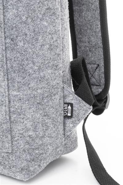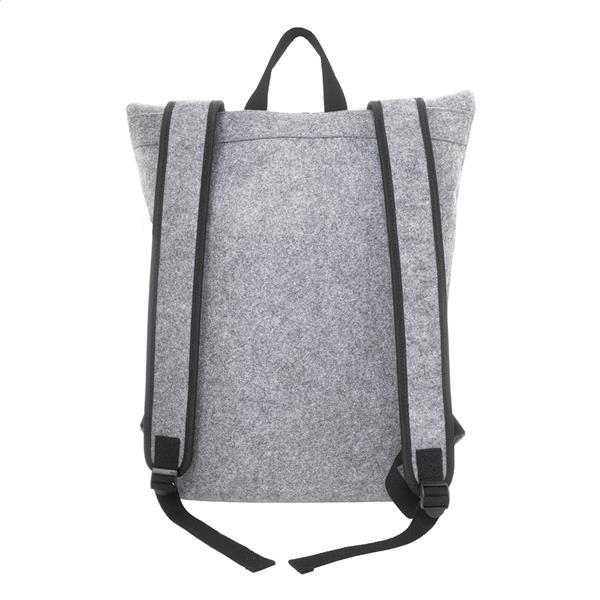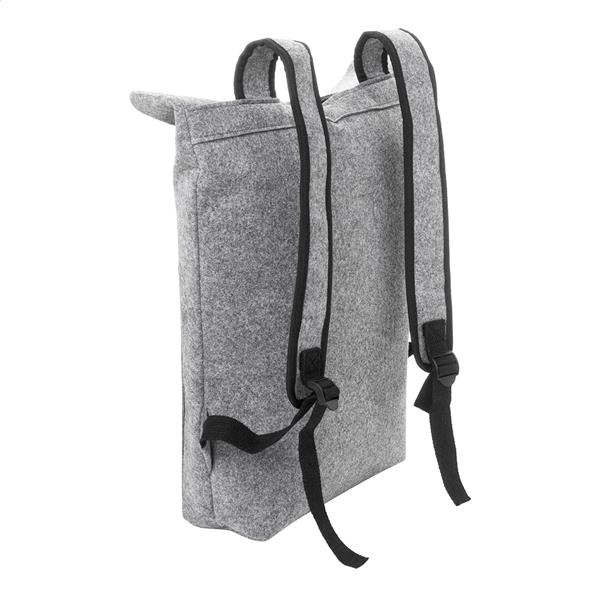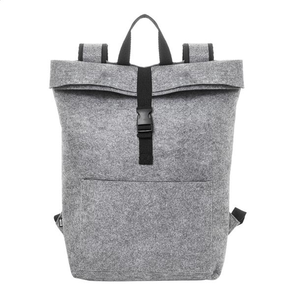 Plecak z filcu RPET z rolowaną górą, zapinaną na klamrę główną kieszenią oraz kieszenią z przodu na suwak, przegrodą na laptopa (15″) i wyściełanymi paskami naramiennymi. Z charakterystyczną metką RPET.