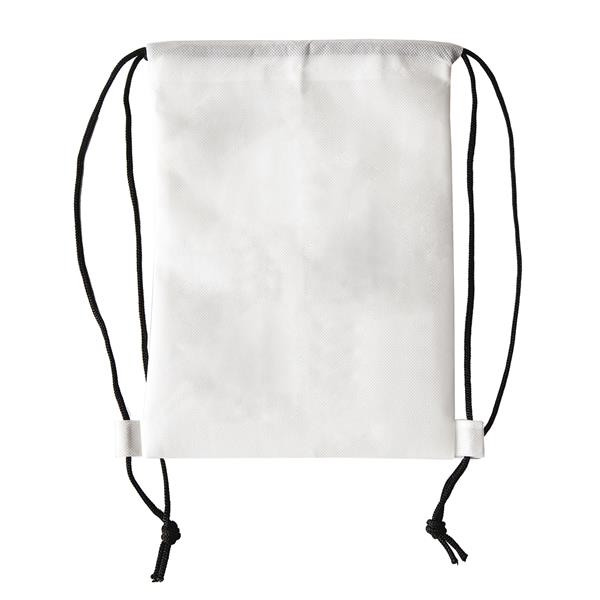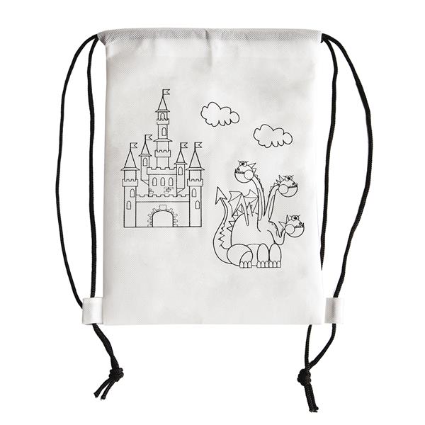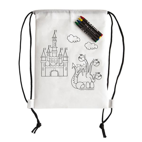 Plecak z materiału non woven w białym kolorze do samodzielnego kolorowania. Wyposażony w 4 kredki woskowe w kolorach: czerwony, niebieski, żółty i zielony.
