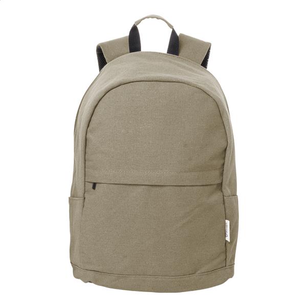 Plecak z płótna z recyklingu z główną kieszenią na suwak, wyściełaną przegrodą na laptopa (15″), kieszenią z przodu na suwak, kieszeniami bocznymi, paskiem do walizki, wyściełanymi plecami i paskami naramiennymi. Z ukrytą kieszenią antykradzieżową. 70% bawełny z recyklingu i 30% poliestru RPET. Z charakterystyczną metką z bawełny z recyklingu.