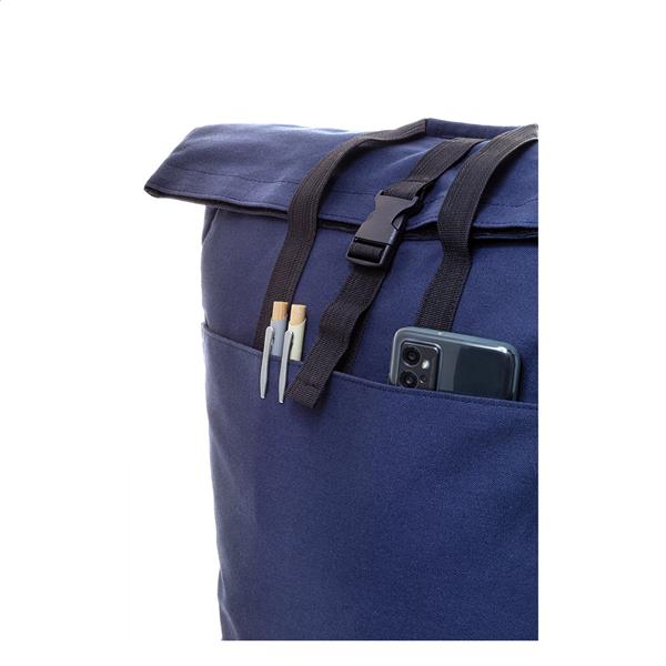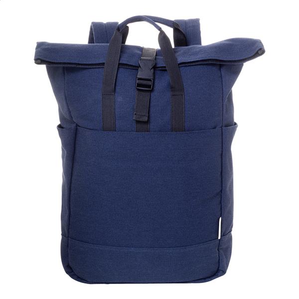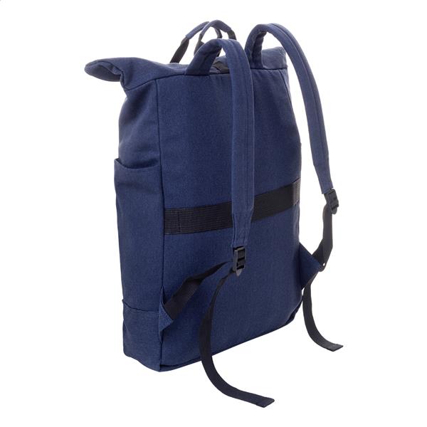 Plecak z płótna z recyklingu z zapięciem na klamrę i rzep, wyściełana przegroda na laptopa (15″), kieszenie z przodu i z boku. Z paskiem do walizki, wyściełanymi plecami i paskami naramiennymi. 70% bawełny z recyklingu i 30% poliestru RPET. Z charakterystyczną metką z bawełny z recyklingu.