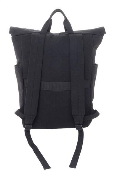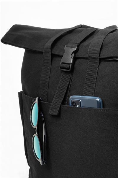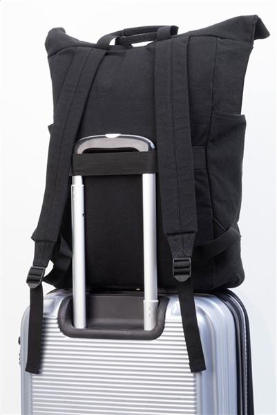 Plecak z płótna z recyklingu z zapięciem na klamrę i rzep, wyściełana przegroda na laptopa (15″), kieszenie z przodu i z boku. Z paskiem do walizki, wyściełanymi plecami i paskami naramiennymi. 70% bawełny z recyklingu i 30% poliestru RPET. Z charakterystyczną metką z bawełny z recyklingu.