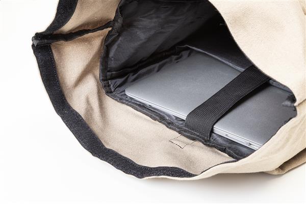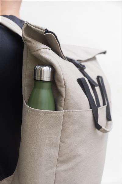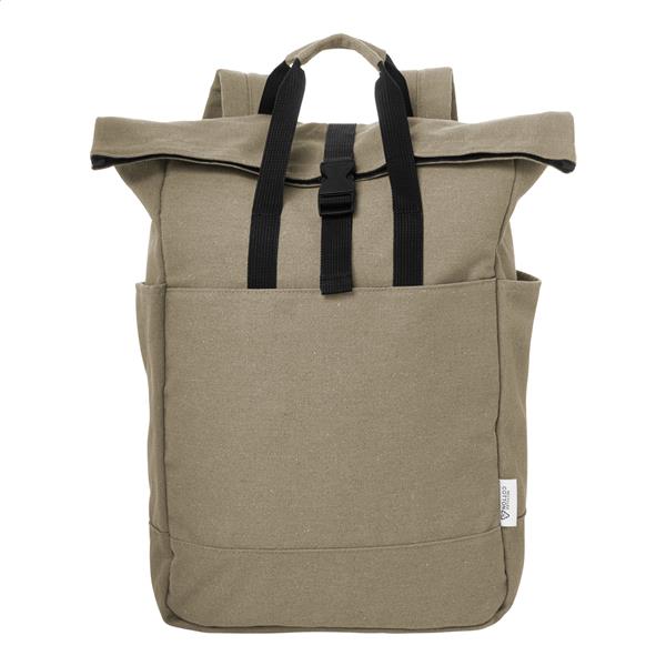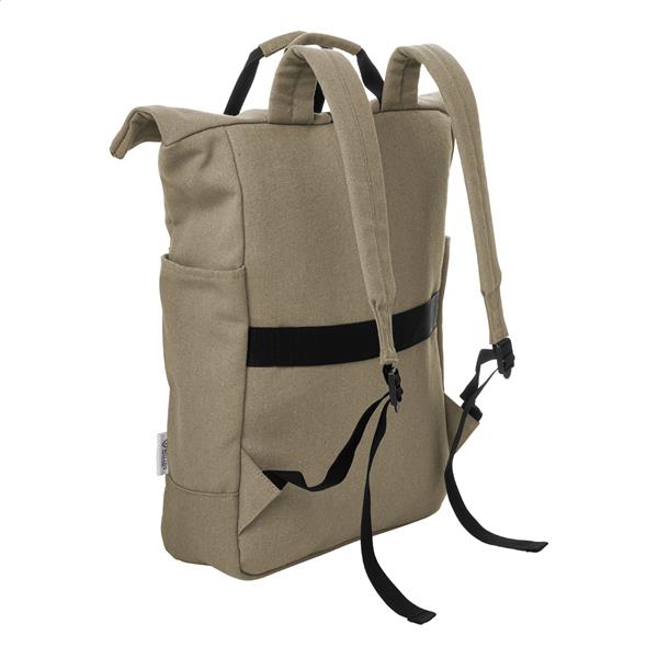 Plecak z płótna z recyklingu z zapięciem na klamrę i rzep, wyściełana przegroda na laptopa (15″), kieszenie z przodu i z boku. Z paskiem do walizki, wyściełanymi plecami i paskami naramiennymi. 70% bawełny z recyklingu i 30% poliestru RPET. Z charakterystyczną metką z bawełny z recyklingu.