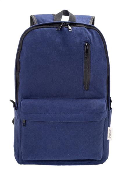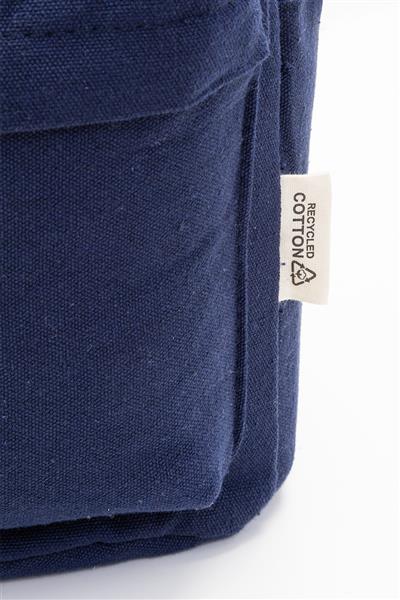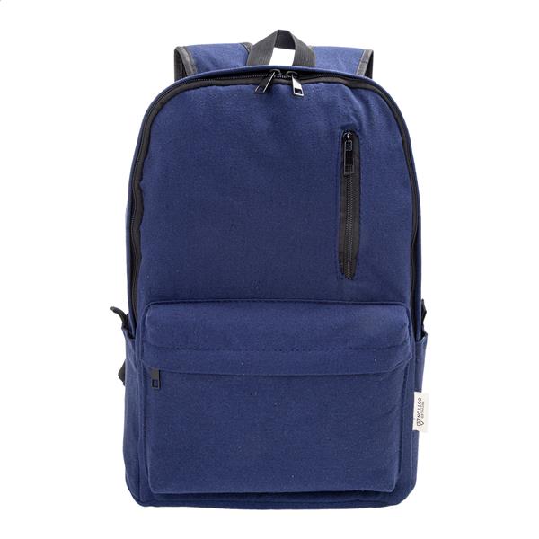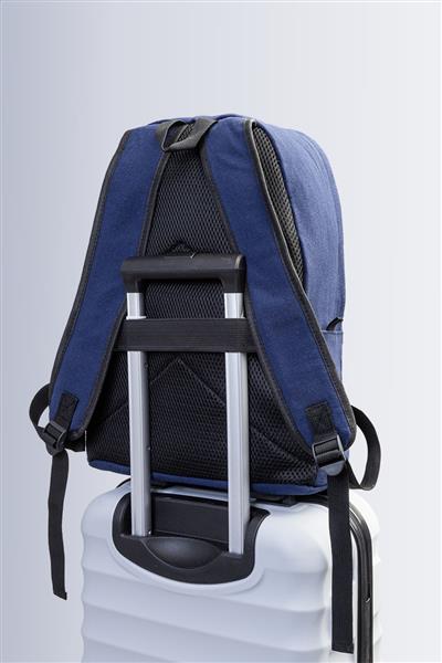 Plecak z płótna z recyklingu z główną komorą zapinaną na zamek, wyściełaną przegrodą na laptopa (15″), 2 kieszeniami z przodu zapinanymi na zamek, kieszeniami bocznymi, paskiem do noszenia na walizce, wyściełanymi plecami i paskami na ramię. Wykonany w 70% z bawełny z recyklingu i w 30% z poliestru RPET. Z charakterystyczną metką z bawełny z recyklingu.