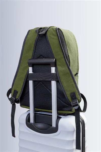 Plecak z płótna z recyklingu z główną komorą zapinaną na zamek, wyściełaną przegrodą na laptopa (15″), 2 kieszeniami z przodu zapinanymi na zamek, kieszeniami bocznymi, paskiem do noszenia na walizce, wyściełanymi plecami i paskami na ramię. Wykonany w 70% z bawełny z recyklingu i w 30% z poliestru RPET. Z charakterystyczną metką z bawełny z recyklingu.
