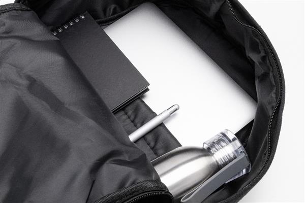Plecak z płótna z recyklingu z główną komorą zapinaną na zamek, wyściełaną przegrodą na laptopa (15″), 2 kieszeniami z przodu zapinanymi na zamek, kieszeniami bocznymi, paskiem do noszenia na walizce, wyściełanymi plecami i paskami na ramię. Wykonany w 70% z bawełny z recyklingu i w 30% z poliestru RPET. Z charakterystyczną metką z bawełny z […]