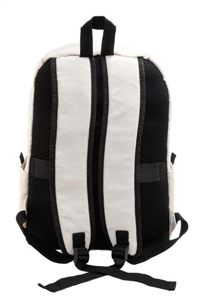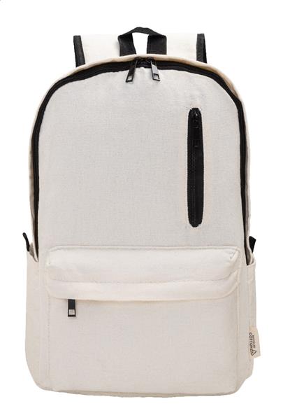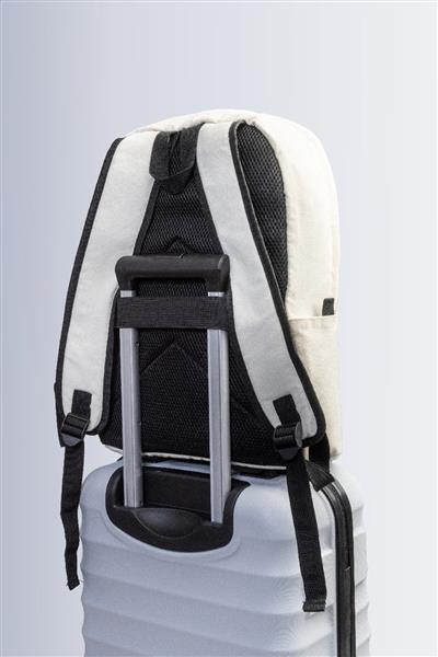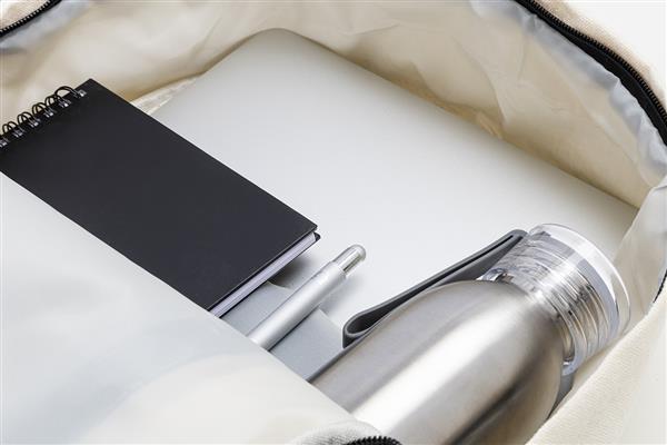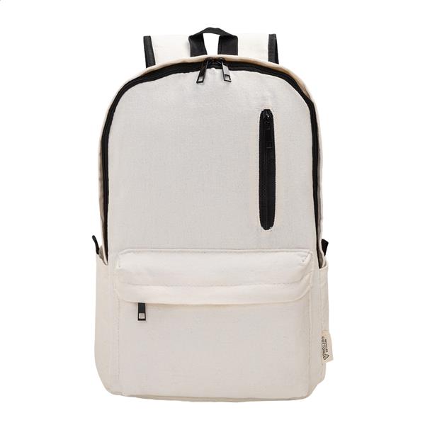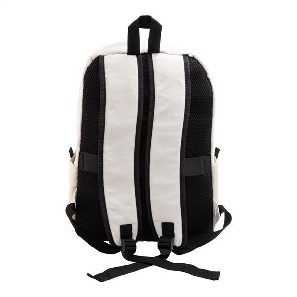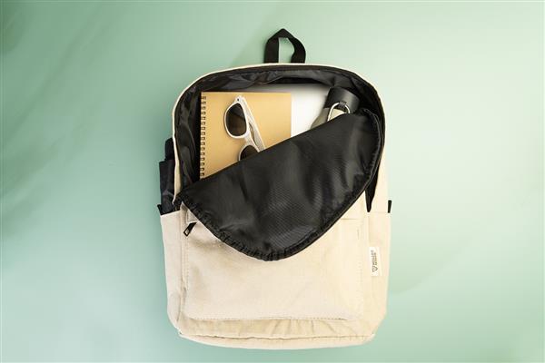 Plecak z płótna z recyklingu z główną komorą zapinaną na zamek, wyściełaną przegrodą na laptopa (15″), 2 kieszeniami z przodu zapinanymi na zamek, kieszeniami bocznymi, paskiem do noszenia na walizce, wyściełanymi plecami i paskami na ramię. Wykonany w 70% z bawełny z recyklingu i w 30% z poliestru RPET. Z charakterystyczną metką z bawełny z recyklingu.
