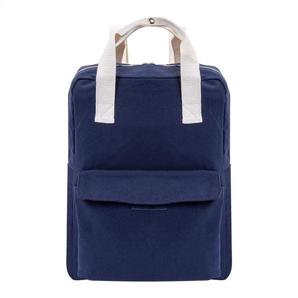 Plecak z płótna z recyklingu z główną komorą zapinaną na zamek, wyściełaną przegrodą na laptopa (13″) i przednią kieszenią zapinaną na rzep. Wykonany w 70% z bawełny z recyklingu i w 30% z poliestru RPET. Z charakterystyczną metką z bawełny z recyklingu.