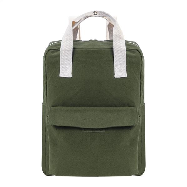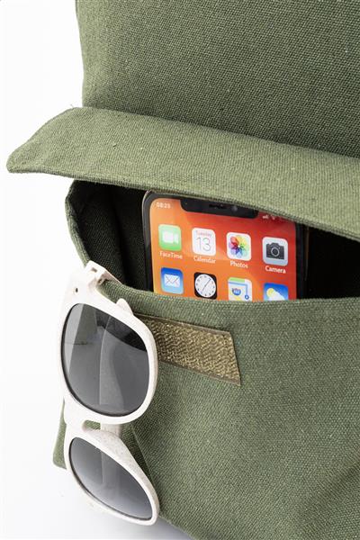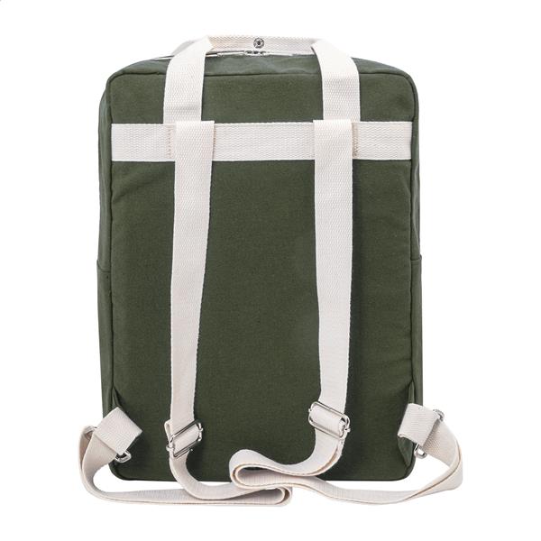 Plecak z płótna z recyklingu z główną komorą zapinaną na zamek, wyściełaną przegrodą na laptopa (13″) i przednią kieszenią zapinaną na rzep. Wykonany w 70% z bawełny z recyklingu i w 30% z poliestru RPET. Z charakterystyczną metką z bawełny z recyklingu.