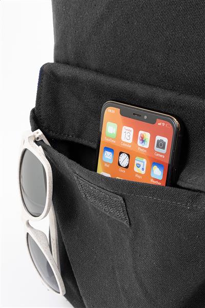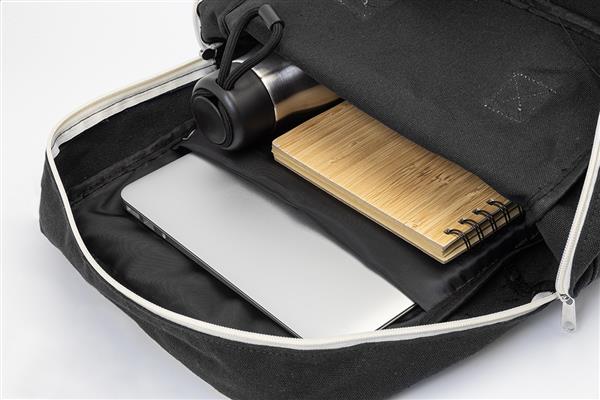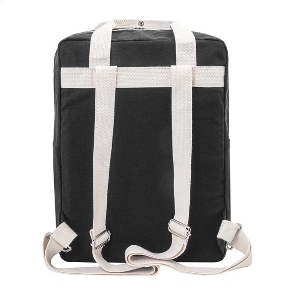 Plecak z płótna z recyklingu z główną komorą zapinaną na zamek, wyściełaną przegrodą na laptopa (13″) i przednią kieszenią zapinaną na rzep. Wykonany w 70% z bawełny z recyklingu i w 30% z poliestru RPET. Z charakterystyczną metką z bawełny z recyklingu.