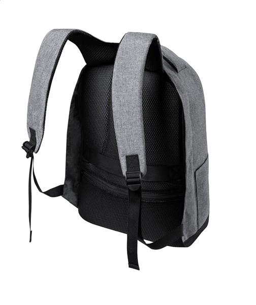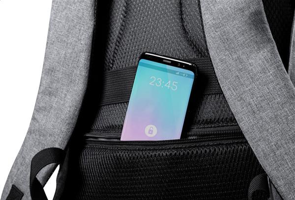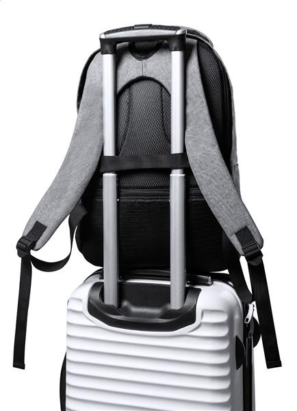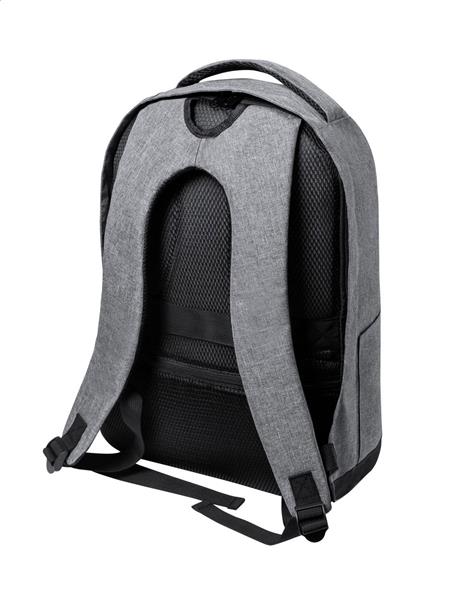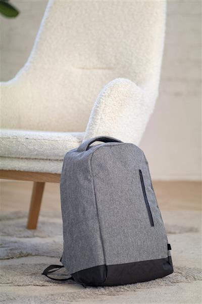 Plecak z RPET z przegrodami na suwak, wyściełaną przegrodą na laptopa (15 „) i tablet (12”), paskiem do walizki, ergonomicznymi tyłem i paskami na ramiona. Z ukrytą kieszenią antykradzieżową. Poliester 600D RPET.