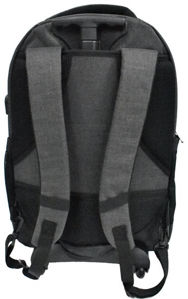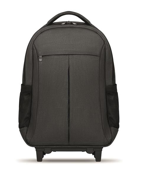 Plecak z kółkami, z poliestru 360D. Wewnątrz komora na laptop 15”, przednia komora z kieszenią na suwak, przegroda na tablet. Wyściełane plecy oraz pasy na ramiona. Zintegrowana osłona na kółka.