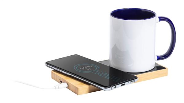 Bambusowy podgrzewacz do filiżanek z wbudowaną bezprzewodową szybką ładowarką indukcyjną (10W). Zawiera kabel USB.