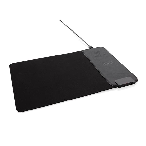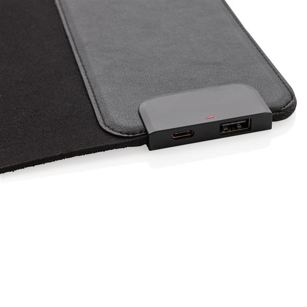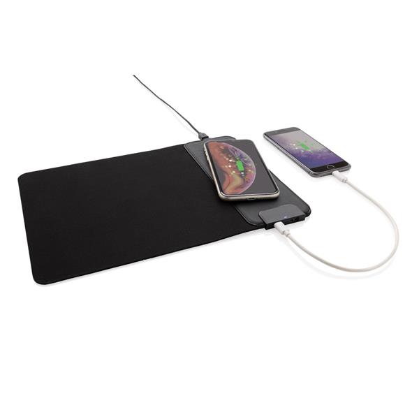 Podkładka pod mysz, szybka ładowarka bezprzewodowa 15W, wyjścia USB i USB typu C do ładowania za pomocą kabla, wykonana z gumy, powierzchnia podkładki z PU, aby korzystać z szybkiego ładowania bezprzewodowego zaleca się użycie adaptera/ładowarki sieciowej USB szybkiego ładowania, bezprzewodowe ładowanie jest kompatybilne ze wszystkimi urządzeniami posiadającymi możliwość ładowania indukcyjnego, wejście 5V/3A, 9V/2A, wyjście USB 5V/1.5A, wyjście USB typu C 5V/1.5A, wyjście bezprzewodowe 15W, 150 cm kabel z TPE bez dodatku PVC w komplecie