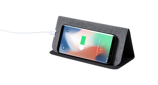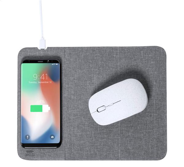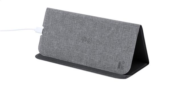 Poliestrowa podkładka pod mysz RPET z wbudowaną ładowarką indukcyjną (10W) i podstawką na telefon. W zestawie kabel USB.