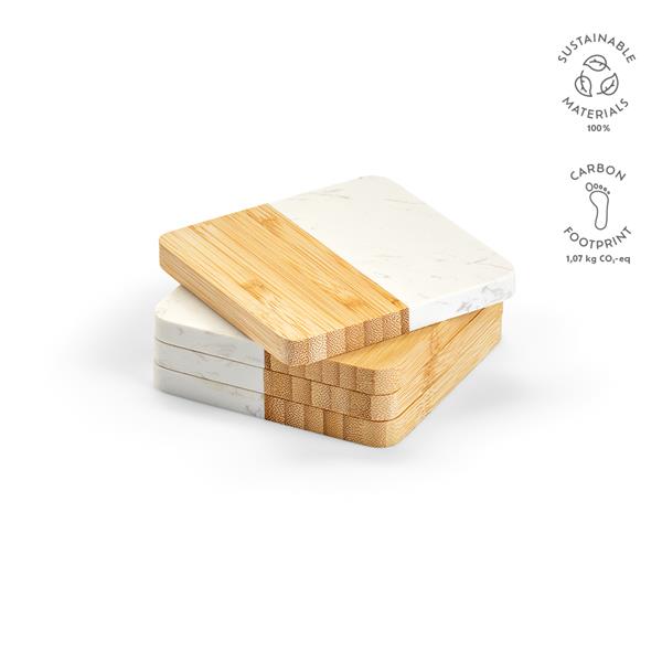Wykonane z bambusa i marmuru podkładki dodadzą wyrafinowania każdemu stołowi. Wymiary 10 x 10 x 2,8 cm zapewniają idealne dopasowanie do szklanek. Dzięki opakowaniu zawierającemu 4 sztuki i pudełku z recyklingu, jest to przyjazny dla środowiska wybór dla Twojego domu.