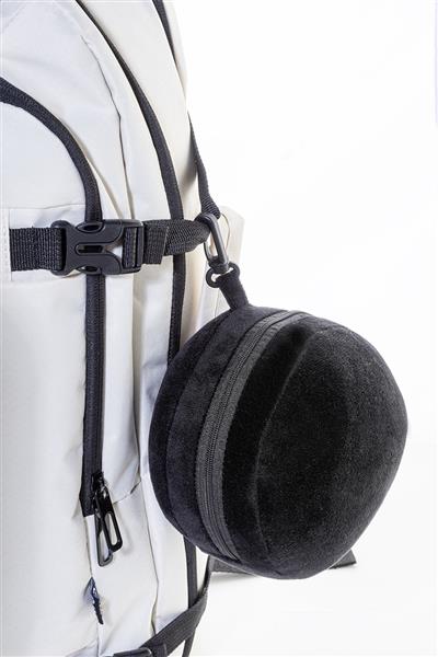 Poduszka podróżna z poliestru RPET ze zintegrowaną maską na oczy i elastycznymi paskami. Zapinana na suwak, tworzy kompaktową kulę, co ułatwia przechowywanie. W zestawie karabińczyk PP do przymocowania do bagażu. Z charakterystyczną etykietą RPET.