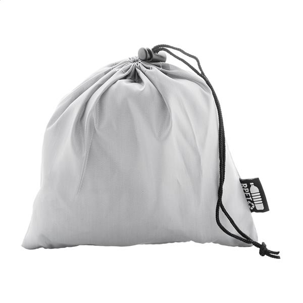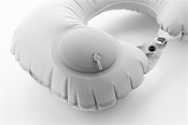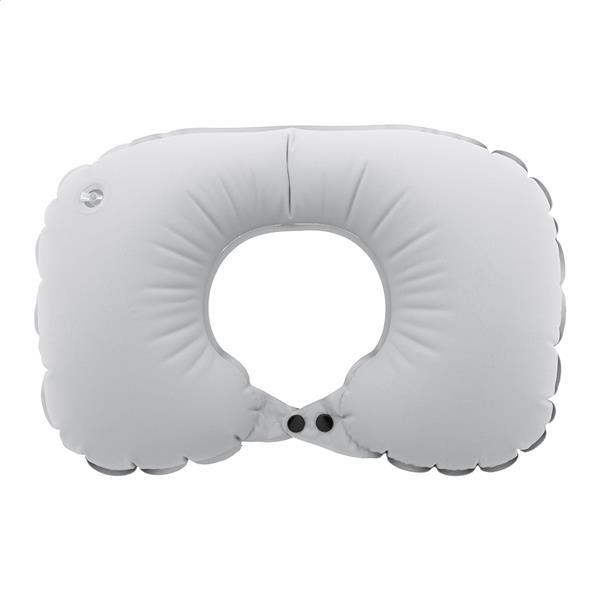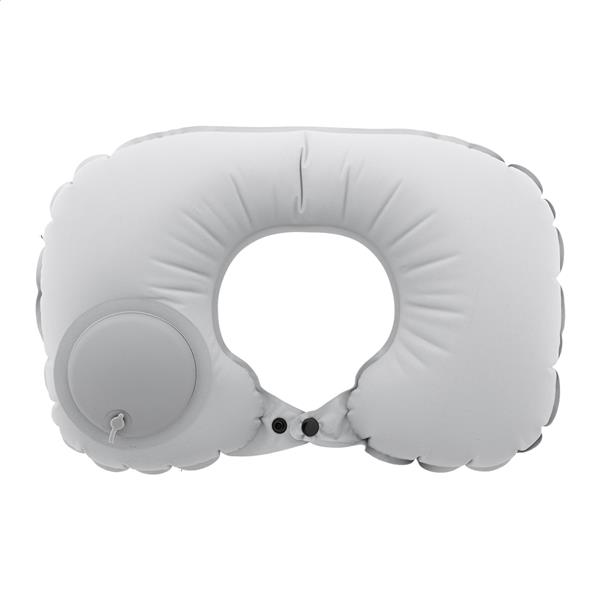 Dmuchana poduszka podróżna z poliestru RPET z wbudowaną pompką do łatwego pompowania i spuszczania powietrza. W pasującym materiałowym woreczku ze ściągaczem. Z charakterystyczną metką RPET.