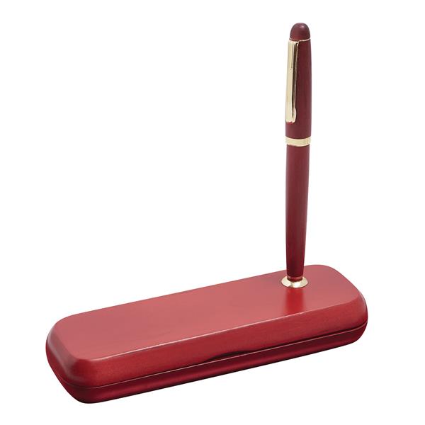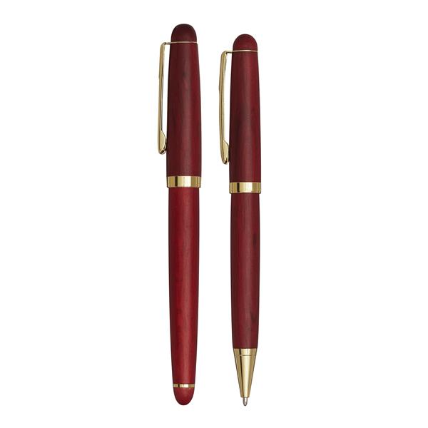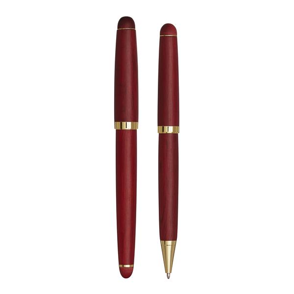 Zestaw z drewna różanego POET składa się z pióra wiecznego i długopisu (niebieski tusz) w etui. Całość z drewna różanego ze złotymi akcentami.