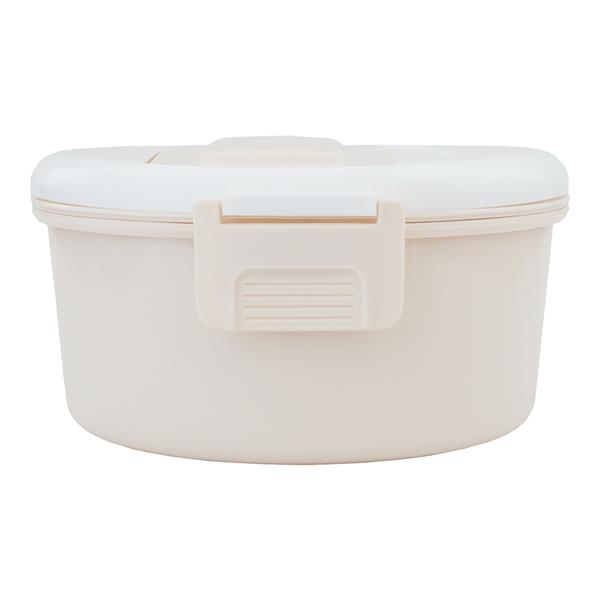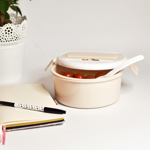 Praktyczny pojemnik na lunch. Bez problemu pomieści sporą sałatkę lub inny posiłek. Składa się z pojemnej miski i mniejszego pojemnika. Posiada również oddzielną przegródkę z widelcem. Pojemność 1000 ml.