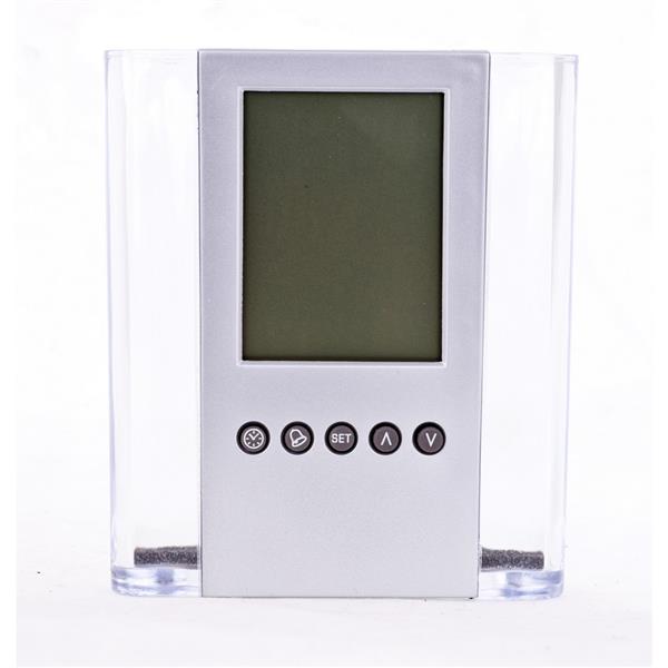 Przezroczysty pojemnik na przybory do pisania z kalendarzem, zegarem, alarmem i termometrem