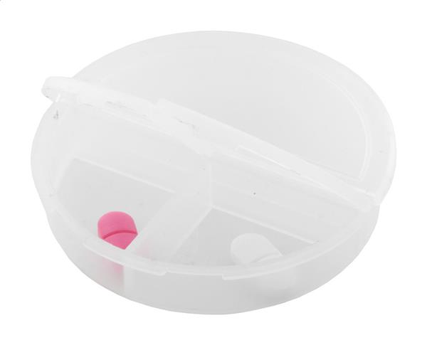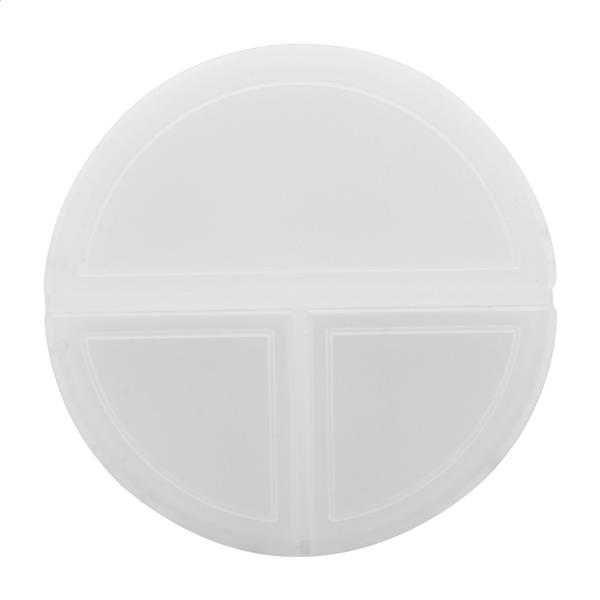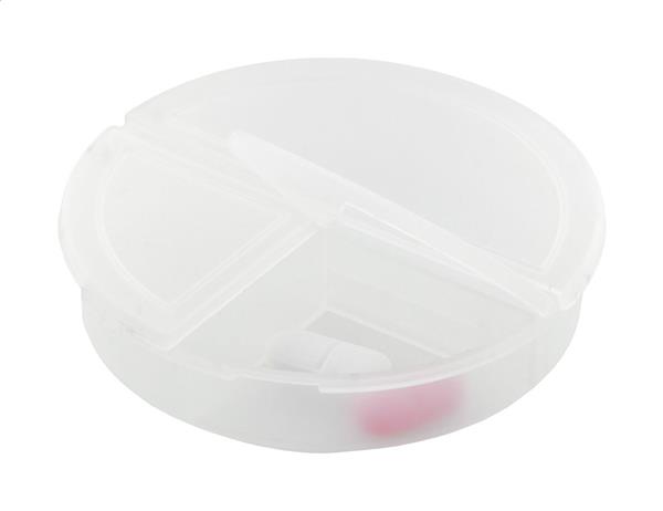 Pudełko na tabletki z tworzywa PP pochodzącego z recyklingu, z 3 przegródkami. Description: Pudełko na tabletki z tworzywa PP pochodzącego z recyklingu, z 3 przegródkami. Primary Color: transparentny Material 1: Plastik PP z recyklingu Rozmiar: o75×17 mm