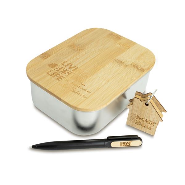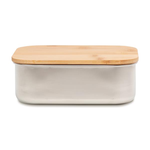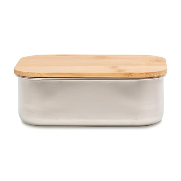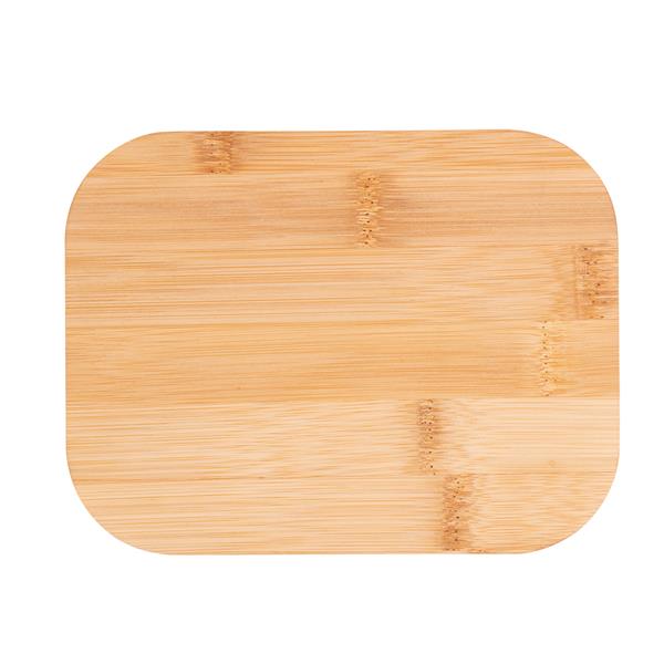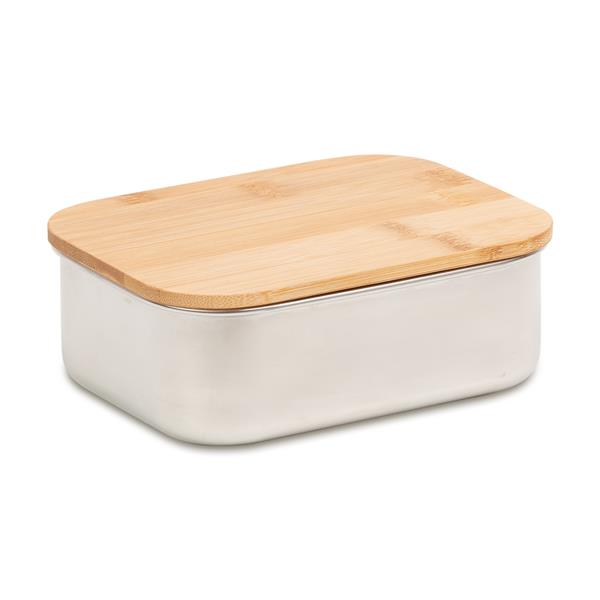 Stalowy pojemnik na lunch z pokrywką z bambusa, którą można wykorzystać jako tackę. Idealny na piknik, do biura, kemping. Pojemność 800 ml.