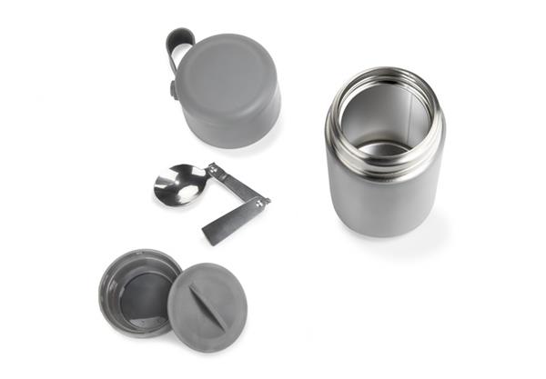 Pojemnik termiczny NOMIO 600 ml to funkcjonalne rozwiązanie do przenoszenia ciepłych posiłków. Wyposażony w szczelne, zakręcane wieczko i gumowy uchwyt, zapewnia wygodne użytkowanie w każdych warunkach. Wewnątrz znajduje się dodatkowy pojemnik z praktyczną, składaną łyżką — wszystko w jednym, kompaktowym zestawie. Dzięki właściwościom termicznym utrzymuje temperaturę jedzenia przez dłuższy czas, co czyni go idealnym towarzyszem w pracy, w podróży lub w terenie. Świetny wybór dla branży outdoor, eventowej i mobilnych zespołów sprzedażowych.
