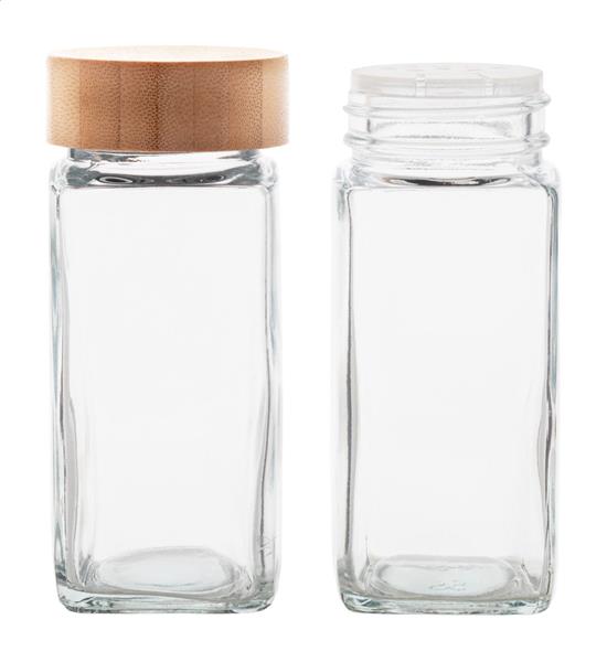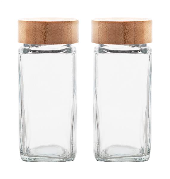 Zestaw 2 szklanych pojemników na przyprawy z bambusową pokrywką, 120 ml. W pudełku z papieru kraft.