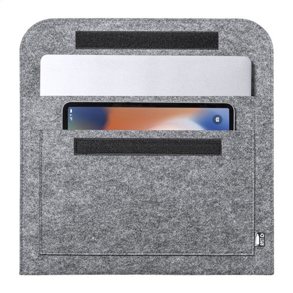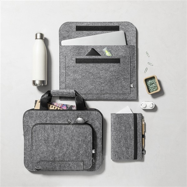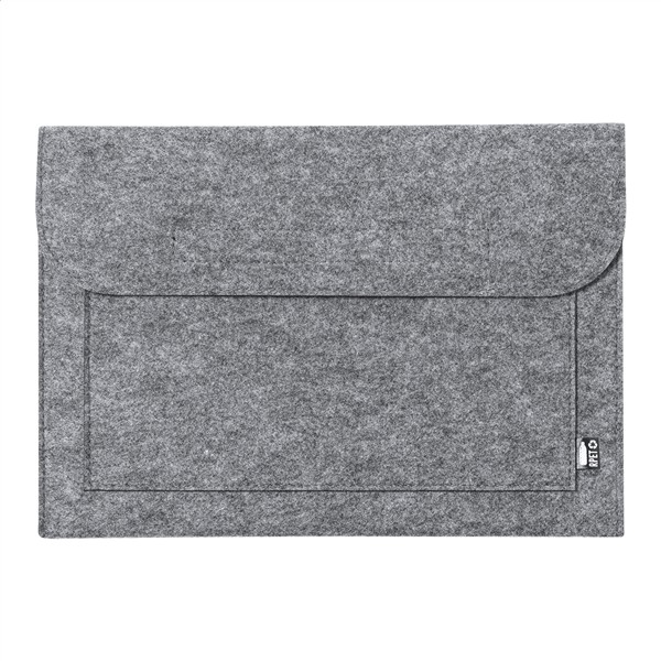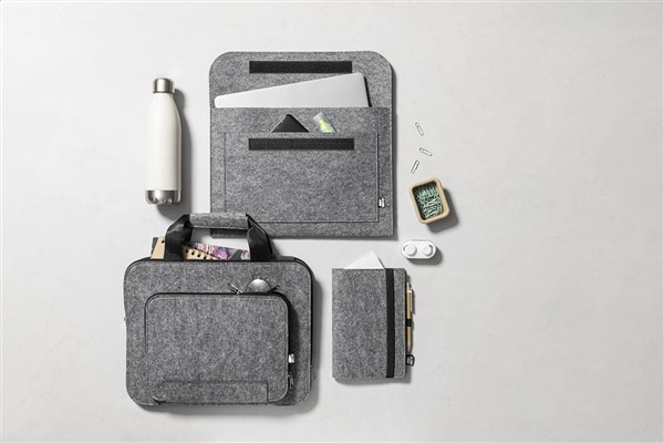 Filcowy pokrowiec na laptopa RPET z przednią kieszenią i zapięciem na rzep. Z charakterystyczną metką RPET.