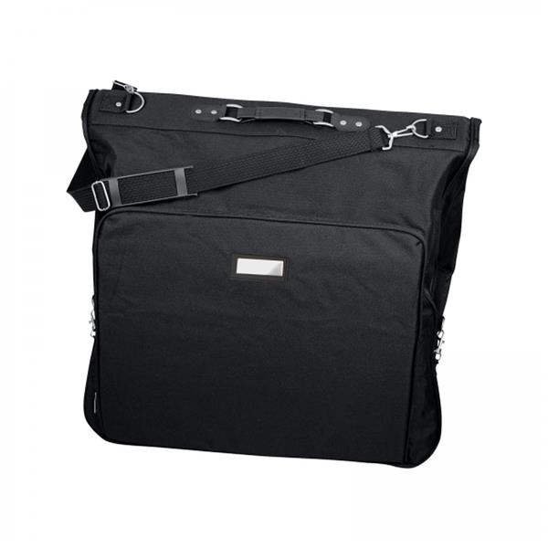Duży pokrowiec na ubrania wykonany z mocnego poliestru, wyposażony w uchwyt, pasek na ramię oraz dodatkową kieszeń i metalową plakietkę na etykiecie ze skóry syntetycznej.