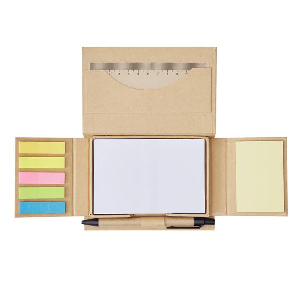 Pudełko na notatki POP UP, rozkładane, zawiera wykonany z mocnego papieru długopis (czarny tusz), linijkę (12 cm), 100 białych karteczek, różnokolorowe karteczki samoprzylepne – wykonane z materiałów nadających się do przetworzenia. Materiał: Papier Kolor: naturalny Tagi: Zeszyty,akcesoria biurowe,karteczki samoprzylepne,karteczki samoprzylepne