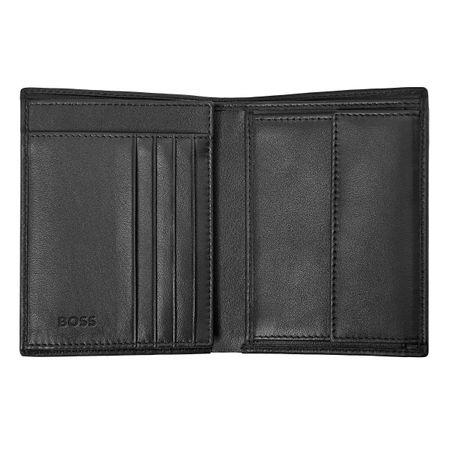 Ten pionowy portfel z klapką i kieszenią na monety jest wykonany ze starannie dobranej, czarnej, gładkiej skóry. Jest ozdobiony luksusową chromowaną tabliczką z podpisem BOSS i posiada wewnętrzną podszewkę z monogramem. Portfel zawiera: 2 przegrody na waluty 8 miejsc na karty 5 przegródek bocznych 1 miejsce na monety Zgodnie z DNA marki BOSS, jest prosty, funkcjonalny, elegancki i minimalistyczny.