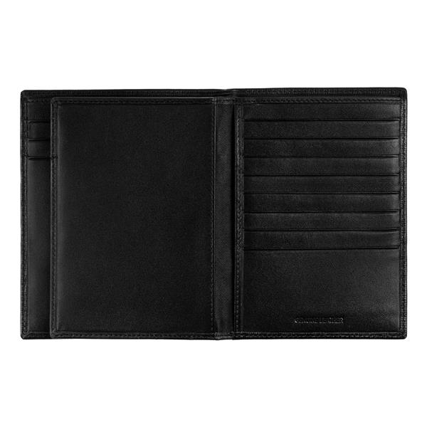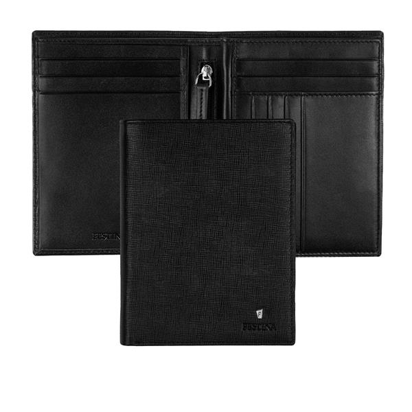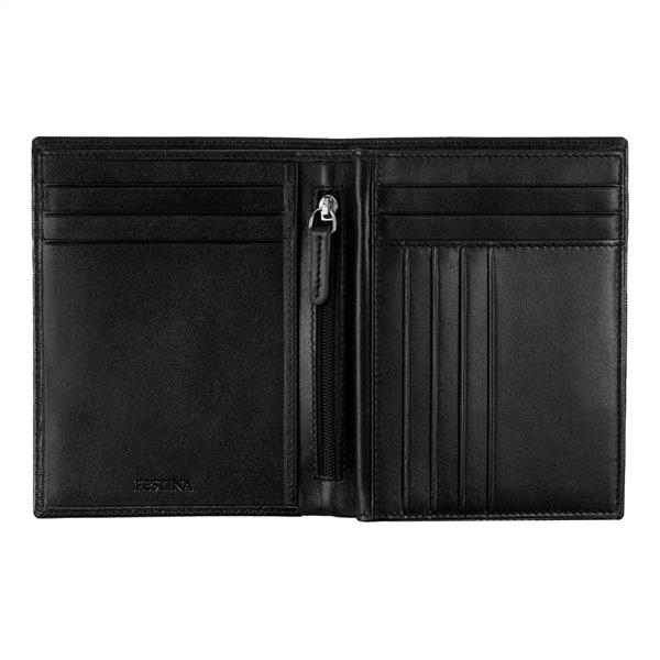 Klasyczny portfel, wykonany z naturalnej skóry. Posiada dziewięć przegórdek na karty kredytowe, dwie przegródki na banknoty oraz kieszonkę na bilon, zamykaną na zamek błyskawiczny.