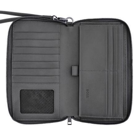 Linia Double B Saffiano wykonana jest ze starannie wyselekcjonowanych skór licowych, charakteryzujących się nadrukiem saffiano w matowym wykończeniu, które nadaje jej wyrafinowany, luksusowy charakter. Każdy element jest starannie wykonany i pięknie wykończony nową płytą Double B w głębokim, pistoletowym kolorze, stanowiącym nowoczesny akcent. Dostępny w kolorze czarnym lub szarym, ten portfel zapinany na zamek błyskawiczny wyróżnia się nowym, sygnowanym suwakiem BOSS, który harmonizuje z wykończeniami. Wnętrze otwiera się w przestronny sposób: lewa strona zawiera 8 przegródek na karty i dużą przegrodę, a prawa strona to pełny portfel z podwójnym klinem, dużą, zapinaną na zamek przegródką na monety, 12 przegródkami na karty i dodatkową przegródką na banknoty. Funkcjonalny i luksusowy, dodaje wyrafinowania codziennym drobiazgom.