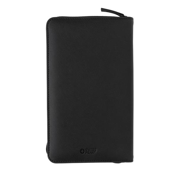 Portfel z ochroną RFID, etui na 4 karty kredytowe, miejsca na bilety, paszport, pieniądze, telefon komórkowy itp., uchwyt na długopis, wykonany z PU z recyklingu z certyfikatem RCS (Recycled Claim Standard) który gwarantuje, że wykorzystane materiały pochodzą z recyklingu, całkowita zawartość materiału z recyklingu obliczona w oparciu o wagę całkowitą przedmiotu: 36,24%, nie zawiera PVC, ślad węglowy produktu: 0,81 kg CO2